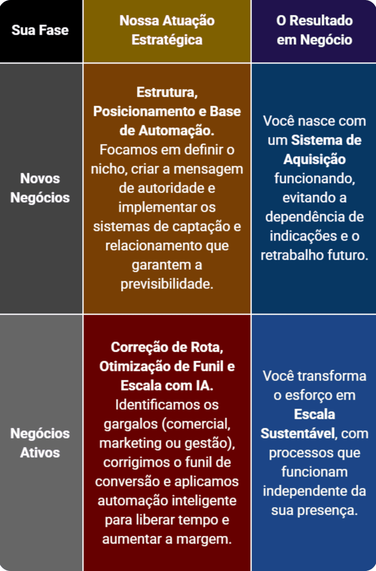 Você está prestes a começar e tem a chance de evitar os erros que custam tempo e dinheiro. A prioridade é definir o posicionamento, construir a base de automação e garantir a previsibilidade desde o primeiro lead, nascendo com a estrutura de um negócio maduro.